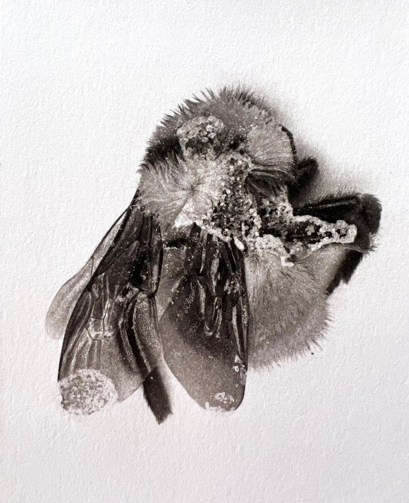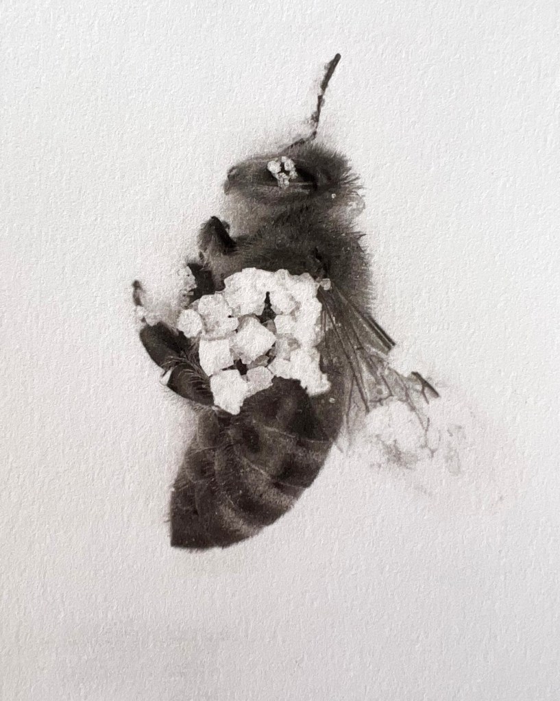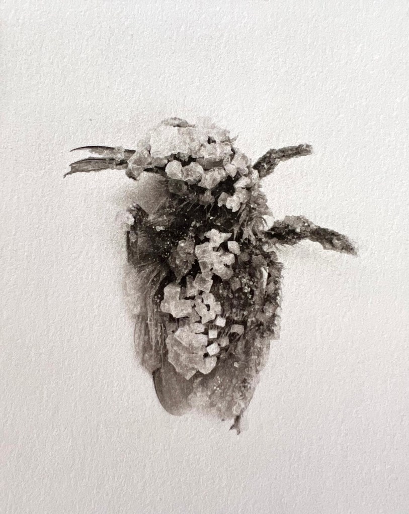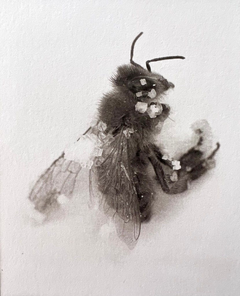 And The Bees Went Still alludes to the ecological catastrophe Utah now faces and becomes more pertinent every day. Palladium prints of bees covered in salt crystals depict a metaphorical future for the beehive state. The insect bodies stand in for both the local residents and the local flora and fauna. While the diversion of water, environmental warming, and mismanagement of the Great Salt Lake continues the ominous threat of toxic airs and raging storms of dust and salt takes steps towards becoming a reality. The delicate images stylistically reference Irving Penn’s cigarette series, who brought attention to the overlooked discard of everyday people, similarly And The Bees Went Still turns to the overlooked, the possible consequences of an environmental tragedy.