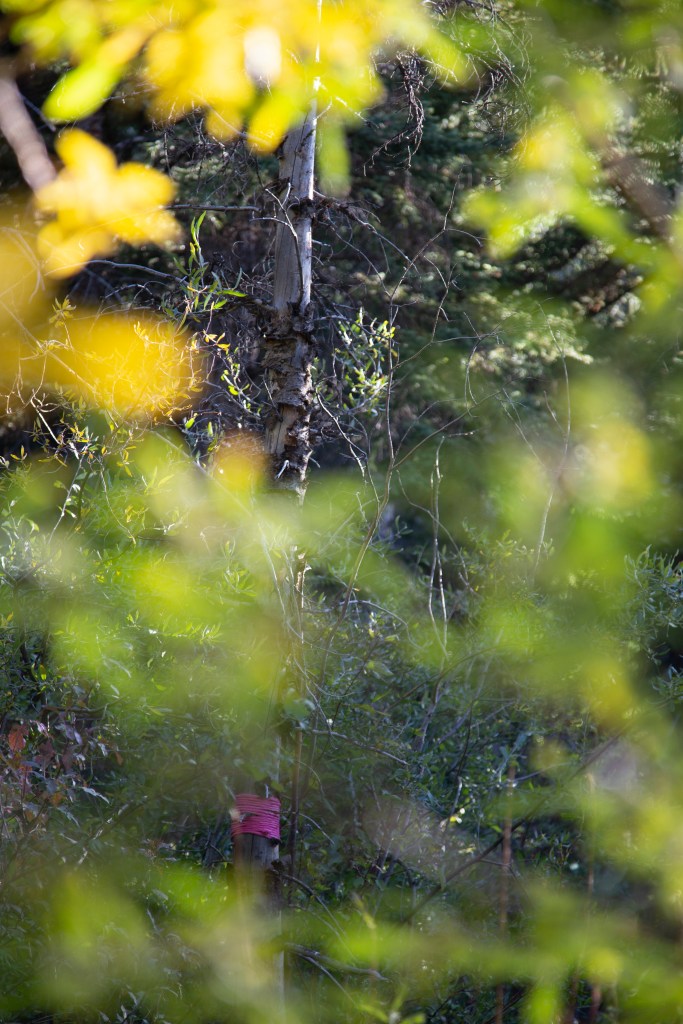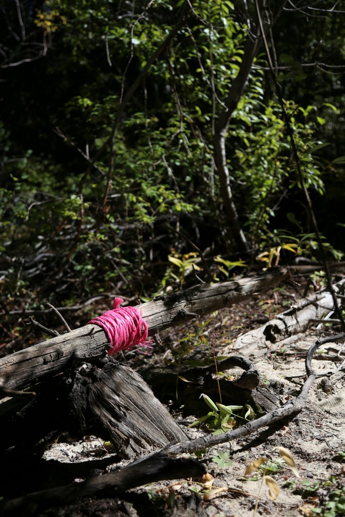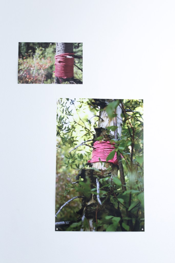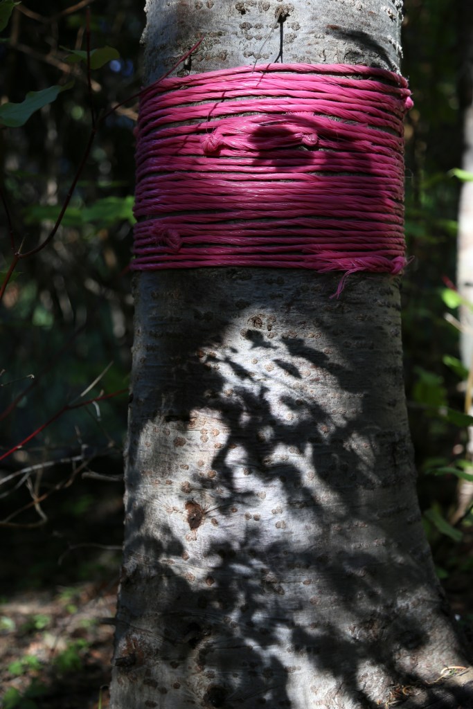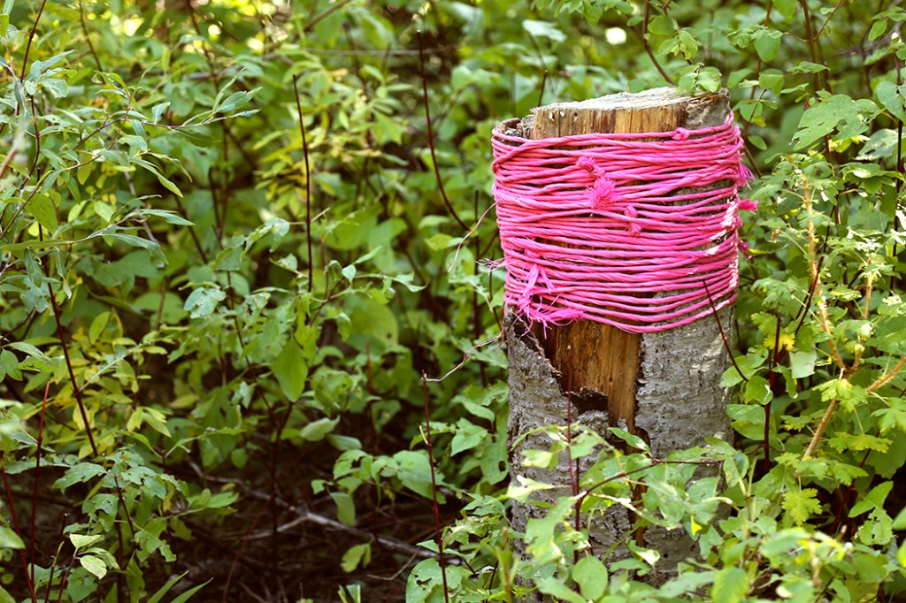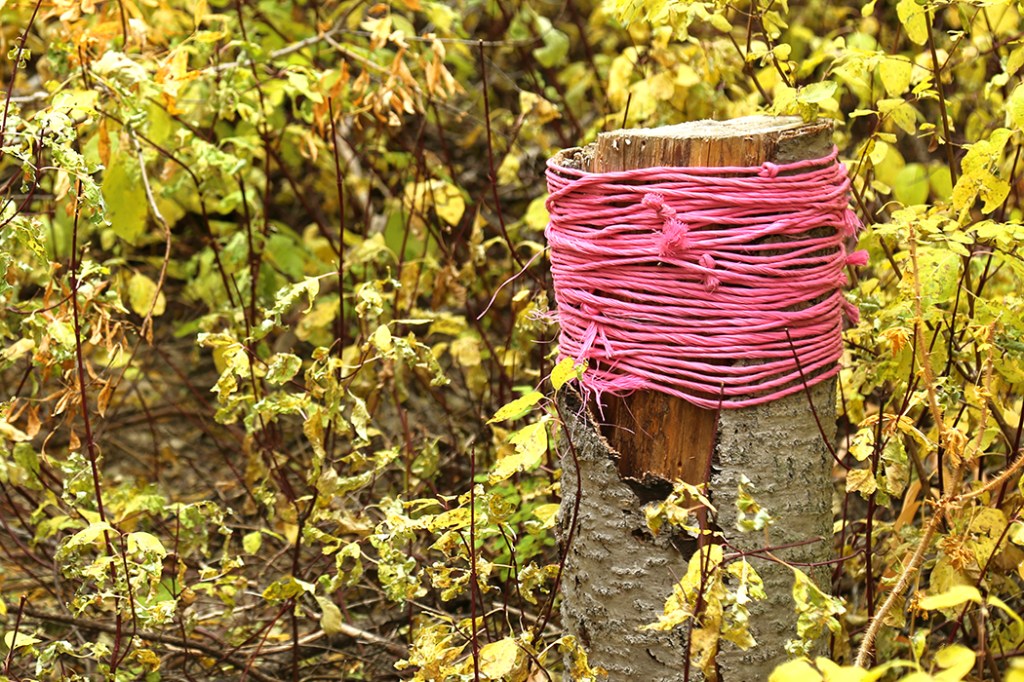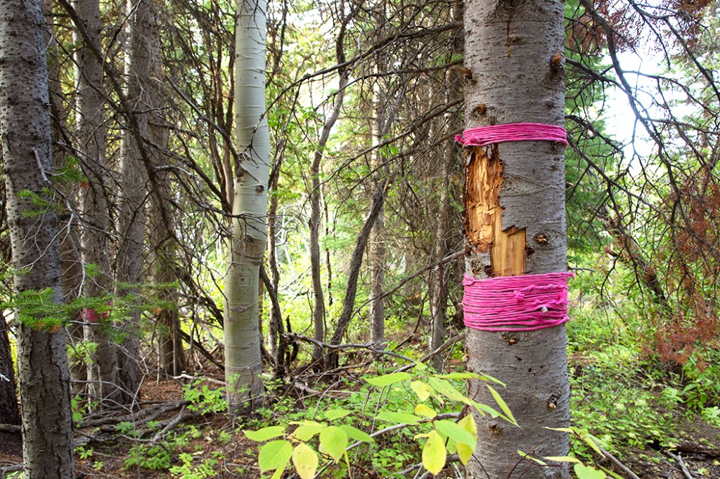 Referencing the 107 year history of the Station as a field research site, the artists use pink bailing twine, sourced from a local agricultural business, as a mark making material. Dead pines were identified as representatives of the beetle kill infestation, by wrapping each tree. In the practice of range management, dead trees are often wrapped or tagged for logging. The binding of individual trees in twine, acts as a caregiving gesture – similar to bandaging a wound, speaking to the larger discourse of how the landscape is ravaged at the hands of development.