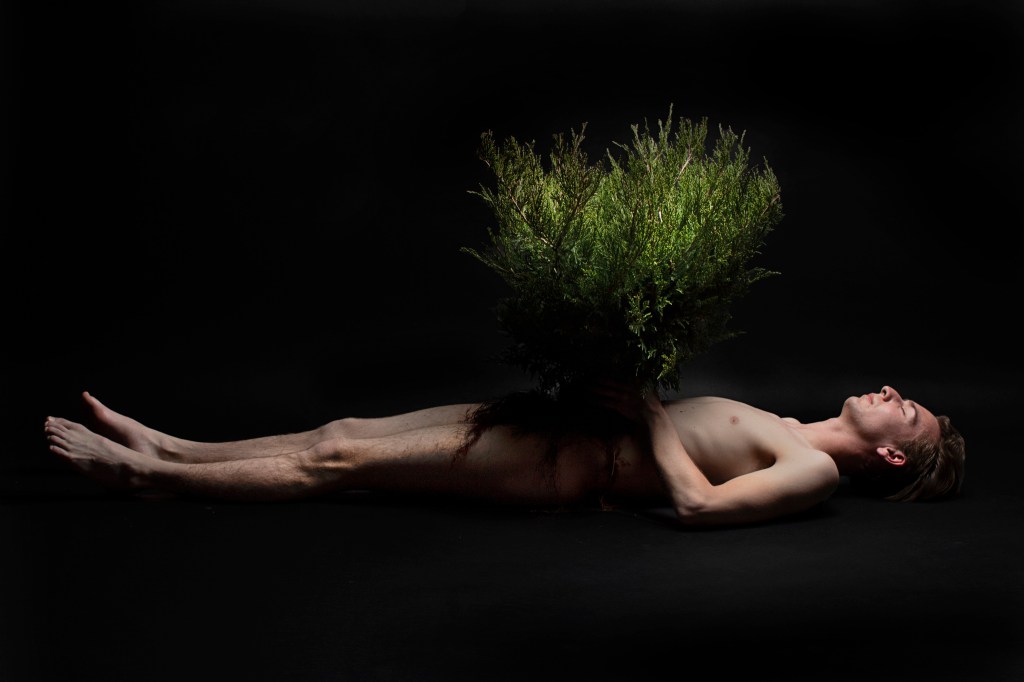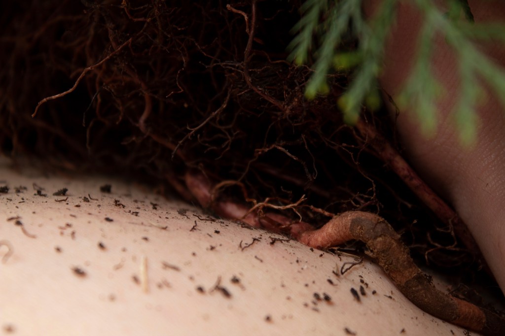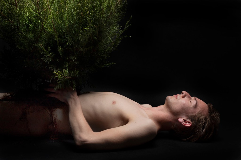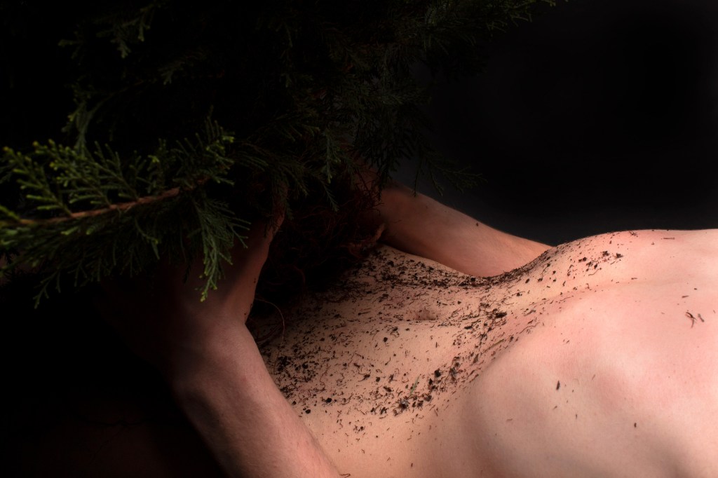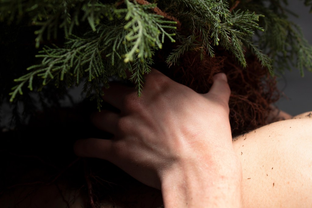 My Body, Your Roots documents the dialog between the cyclical relationship of life and death, rot and birth, while simultaneously exploring the reciprocity between earth and persons. Through the act of support and rest My Body, Your Roots explores the interconnectivity, culling, and nurturing relationship of human and land. Juniper, a local tree, stands in as an icon of the earth, while the artist rests in an attempt to both stabilize and balance the exposed shrub. The vulnerability of both plant and artist creates space for deeper connection, as the plant rests on the stomach of the artist the roots drape over the body, skin to skin, this touch in turn, with the breathing of the artist and the output of oxygen from the plant, fuses the body to the plant creating a oneness between the two. Over the course of two hours this connection is maintained and explored through the lens of the camera. The closeness of the two appears to be both an echo of a funerary arrangement or an intimate exchange; both a display of the formed bond. The durational examination of human interconnectivity with land and specifically fauna, elaborates on the closeness we share with nature while alluding to the continued weight both press upon one another.